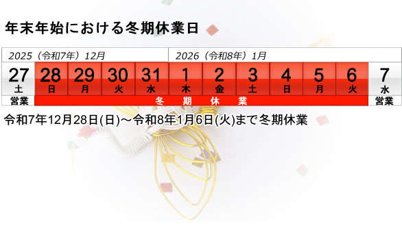 休業中もFAX、E-mailにつきましては受付しておりますが、ご回答は2026年1月7日(水)以降に順次対応させていただきます。